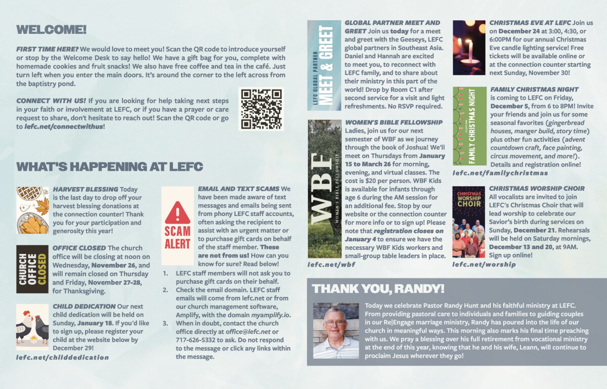 Weekly Bulletin11.23.25 | BulletinClick the title of the recent bulletin that you want to preview. 11.23.2025 Bulletin 11.16.2025 Bulletin 11.09.2025 Bulletin