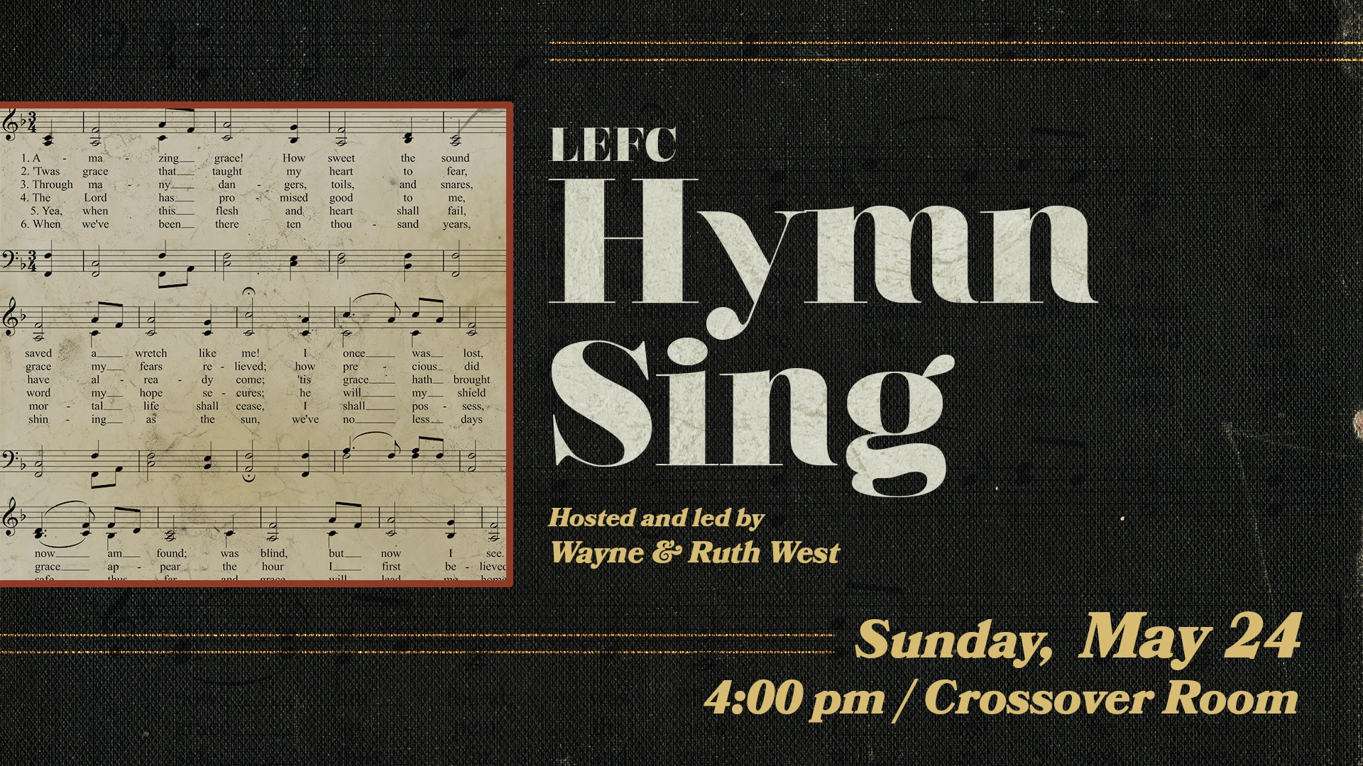 Do you love hymns and spiritual songs? LEFC is hosting a hymn sing with Wayne and Ruth West at 4PM on Sunday, May 24, in the Crossover Room. We hope you can join us for this special afternoon of worship!