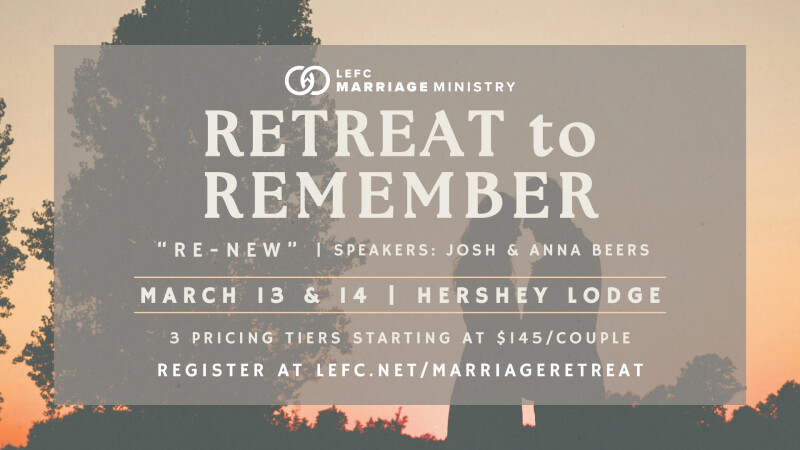 All married couples are invited to attend our annual marriage retreat on March 13-14, 2026! We believe God places a high value on marriage, and we hope to encourage you in yours! The retreat will be held at the Hershey Lodge beginning at 7:00 PM Friday evening and will finish by 4:30 PM on Saturday. Consider going on a date for dinner before the event gets underway Friday or after it ends on Saturday afternoon!