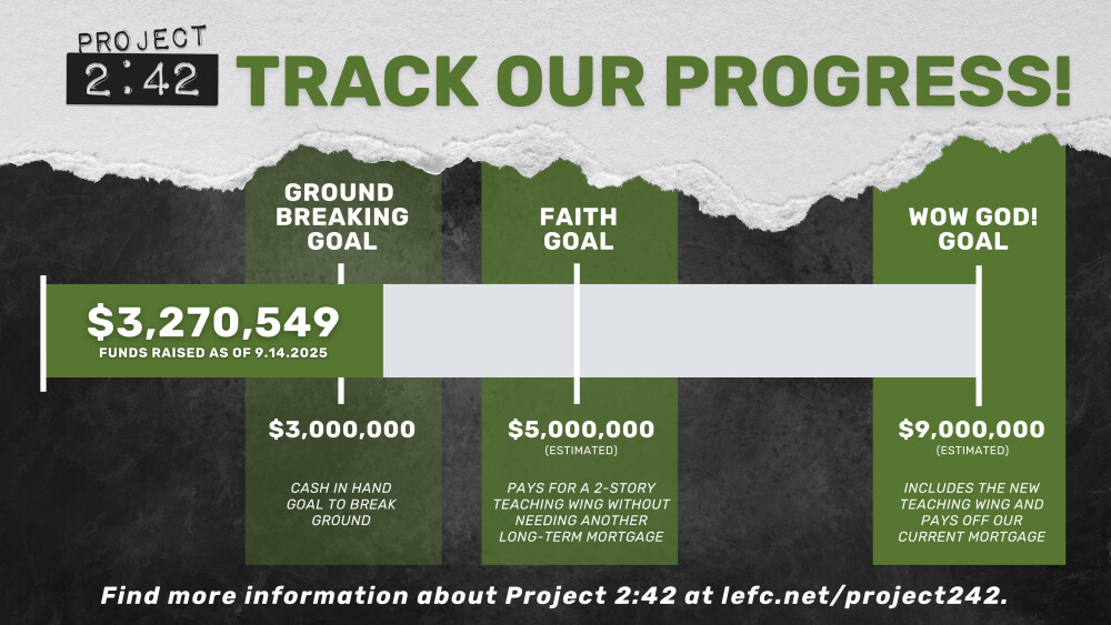 In short, Project 2:42 is a building expansion project to add additional classrooms and teaching space to LEFC's facility. But it's more than a building project. It's a faith journey and an invitation to devote yourself to prayer as you seek God's leading. Keep reading to learn more!